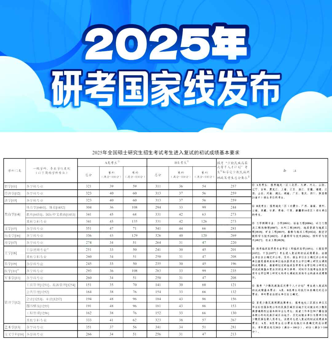 2月24日,教育部发布《2025年全国硕士研究生招生考试考生进入复试的初试成绩基本要求》(国家分数线)。各招生单位根据《2025年全国硕士研究生招生工作管理规定》,在国家分数线的基础上,自主确定并公布报考本单位的考生进入复试的初试成绩要求及其他学术要求。