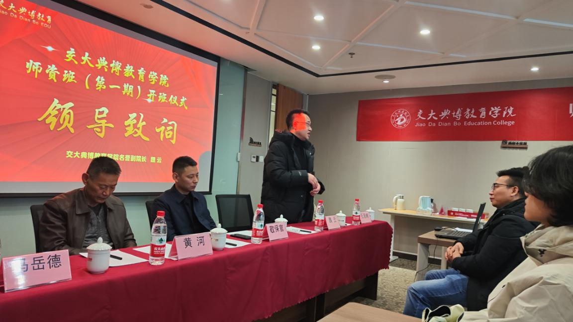 会议伊始,交大典博教育集团董事长敬保官、总裁黄河分别致辞。敬董详细介绍了学院建设背景、办学宗旨及未来规划,强调了学生生涯规划与学习陪伴的重要性,期望学员珍惜学习机会,努力提升专业素养,共绘教育蓝图。黄总则表达了对师资班开班的祝贺。并承诺学院将秉持“以学生为中心,以质量为根本”的理念,提供全面的培训和实践机会,助力学员职业发展。